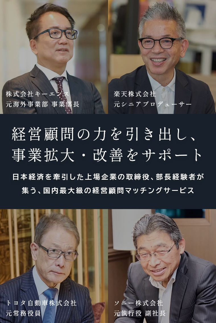 大手企業や上場企業の取締役・部長経験者らを中心とした43,000名以上の参画顧問の知見と人脈によって、7,000社以上の中堅・ベンチャー企業を支援しております。